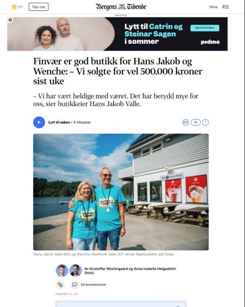 Nærbutikken Feste; Bergens Tidende; Finvær er god butikk for Hans Jakob og Wenche: – Vi solgte for vel 500.000 kroner sist uke